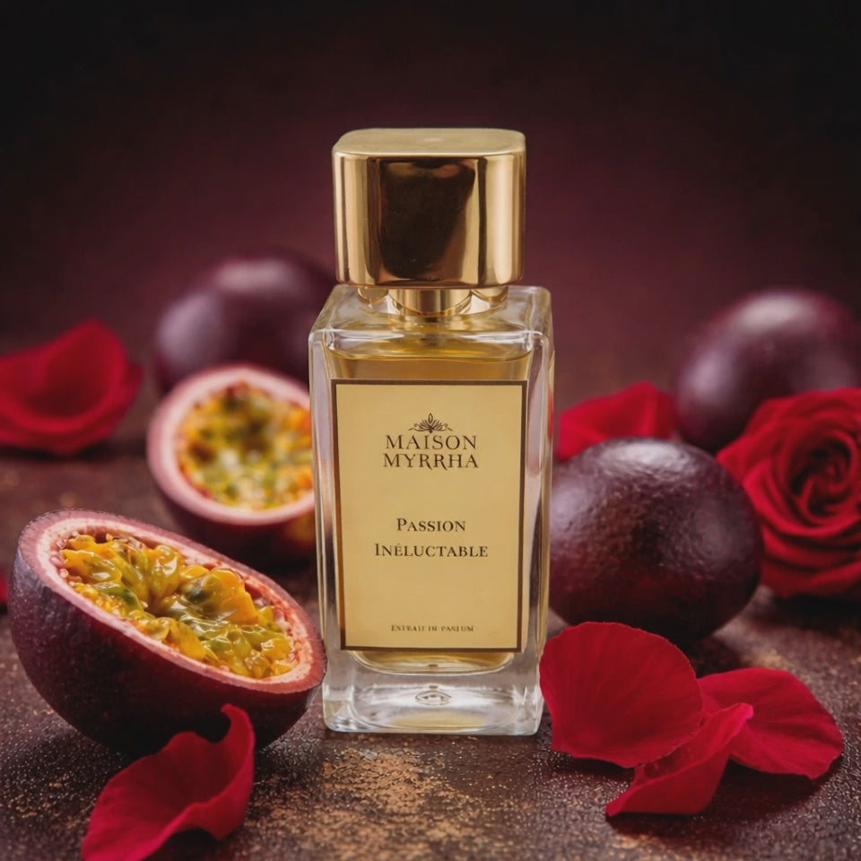 Passion Inéluctable naît d’un désir impossible à fuir. Les fruits de la passion éclatent en tête, enrobés de safran chaud et de rose délicate. Le cœur révèle un cuir profond, mêlé d’oud et de benjoin, sombre et envoûtant. En fond, l’ambre et la vanille scellent l’étreinte. Un parfum magnétique, intense, fait pour ceux qui ne résistent pas à l’inévitable.